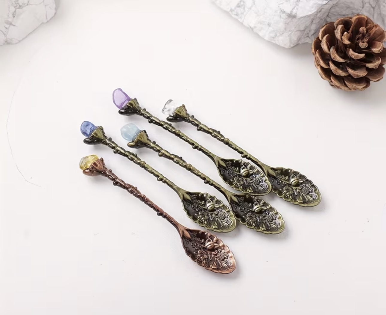 Each Crystal Tea Spoon comes with a natural crystal chosen by fate. The crystal you receive will be sent at random, allowing the one meant for you to find its way into your hands. Often the crystal that appears carries the energy you may need most in that moment.